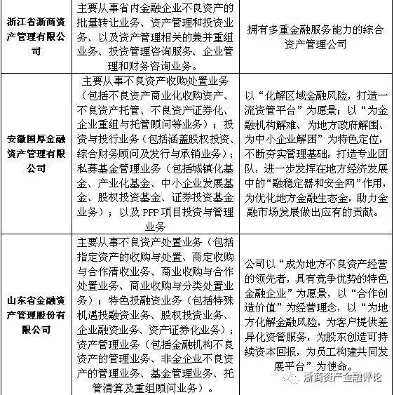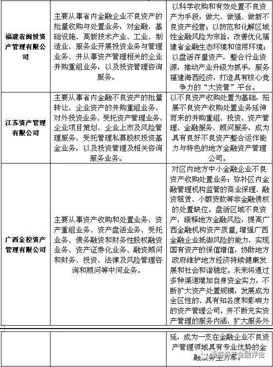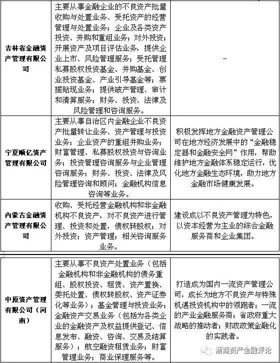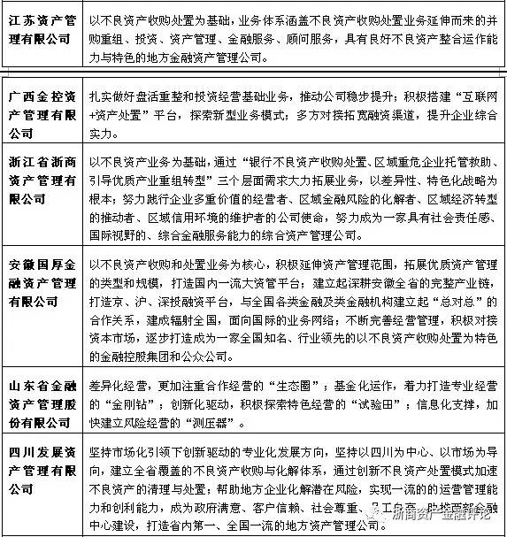 資產管理公司對不良資產的處置需要運用到多種手段,因此,開展相關業務輔佐不良資產的處置就顯得尤為重要。但由于各地方AMC的定位不同,其所開展的主要業務也有所差異,例如有些地方AMC將自身定位為地方不良資產的“收集器”,因此主要以收購不良資產業務為主;而有些地方AMC則側重于解決地方政府和國有企業的不良資產問題,在開展不良資產業務的同時還開展結構化業務;還有部分地方AMC以市場化的資金業務為主,將自身打造為地方綜合金融服務平臺。具體如下表所示: