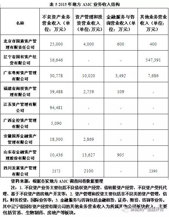 由上表分析可以發現,地方AMC的經營策略雖各不相同,但大致可以分為以下三類:一是走專業化的資產管理道路,在不良資產處置業務的基礎上,開展投資融資業務,基金管理業務和投行業務等,提升資產管理業務的綜合實力。以浙江省浙商資產管理有限公司為例,浙商資產依托其核心的不良資產處置與經營業務的專業能力,開展了托管、清算和重組業務,并憑借政府和社會力量的支持,設立地方基金,為當地企業提供資金支持。二是根據區域潛在需求,打造地方專屬業務。以重慶渝富資產經營管理集團有限公司為例,由于重慶海綿城市建設項目和主城區內污染企業搬遷的進行,渝富集團相應的開展了土地經營業務和城市建設業務,主要負責重慶主城污染搬遷企業、破產關停企業、退二進三企業土地收儲工作和土地開發、基礎設施建設及相關產業投資等。土地經營業務和城市建設業務的開展形成了一定的協同效應,將破產重組、不良資產處置、土地收購、土地開發與投資、基礎設施建設等串聯了起來,形成了一條完整的業務鏈條,在提升各業務運營效率的同時,提高了業務收益水平,滿足了地方城市建設的需要。除此之外,山東金融資產管理股份有限公司對當地農信社的不良資產進行整體收購處置也是極具代表性的例子之一--農信社是山東省營業網點和從業人員最多、服務范圍最廣、資金規模最大的金融機構,為配合將農信社改制為農村商業銀行,激發發展活力,山東金融資產管理股份有限公司對農信社的不良資產展開了收購,并形成了一套以信托方式解決的可行方案,助力當地農信社改革。三是打造區域金融平臺,借助平臺優勢開展多元化業務結構,并進行一定的金融創新。還是以浙江省浙商資產管理有限公司為例,浙商資產依靠自身業務平臺和與當地政府和金融機構的聯系,為企業提供多樣化的服務,如供應鏈金融服務、財務管理和戰略咨詢業務;同時還運用金融創新工具,對企業開展不良資產遠期收購業務和互聯網金融服務等等。