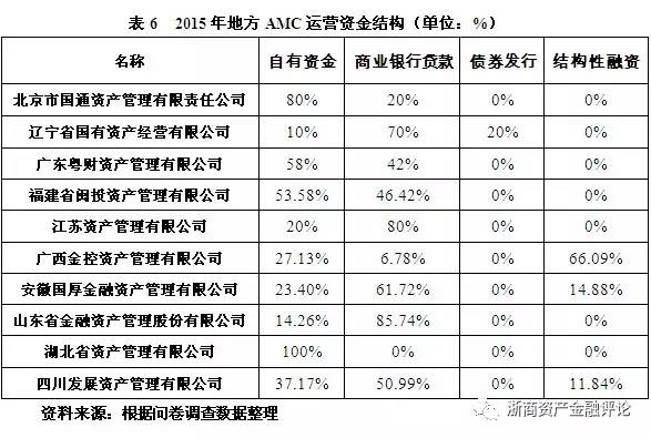 營運資金來源。除了股權資金以外,地方資產管理公司在具體項目運作時的營運資金目前仍主要來自自有資金、政策性銀行及商業銀行貸款,其次是債券發行、結構性融資等。部分地方AMC可以從集團借款,但占比較小。表6是根據問卷對已有資產項目運作的地方AMC運營資金來源的統計: