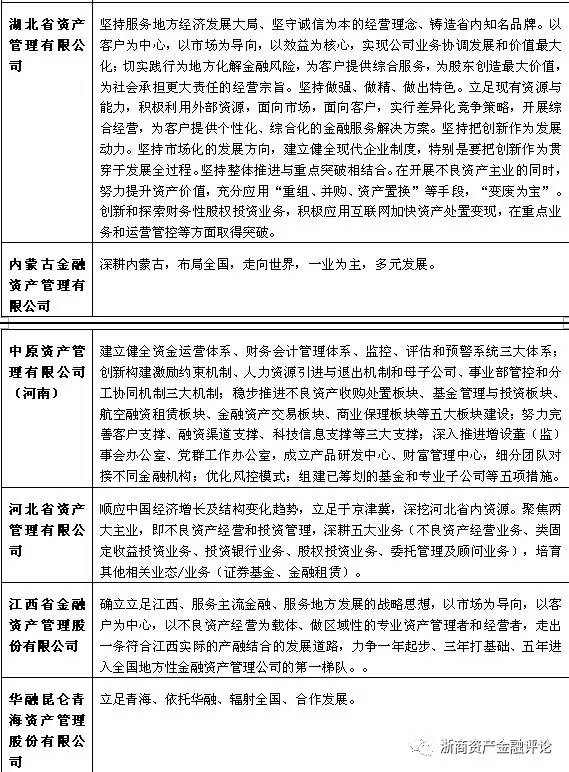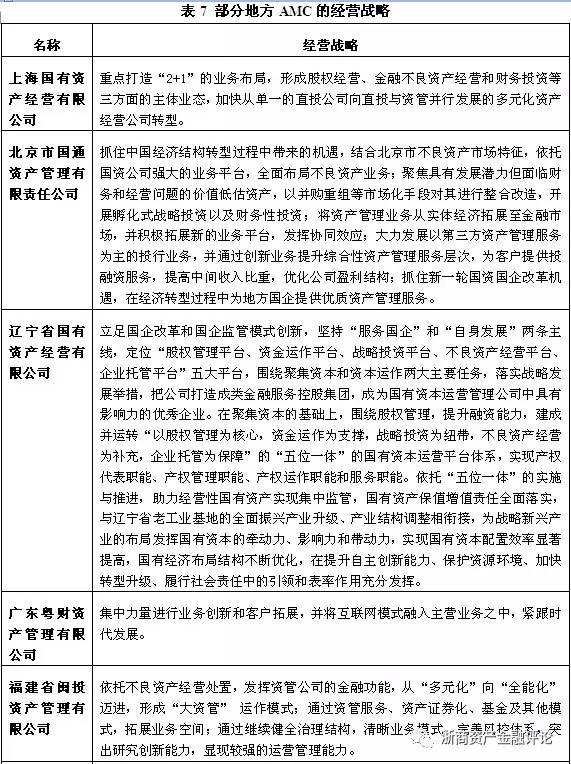 從整體上來看,地方AMC圍繞著不良資產處置這一基礎業務開展了多種相關業務,通過設立基金、不良資產證券化、債轉股和并購重組等方式對不良資產處置鏈進行挖掘。而從業務拓展上升到戰略層面,各地方AMC也都在積極的整合當地資源,與地方政府、銀行和其他金融機構尋求合作,并根據地緣特征和相關的股東背景,發掘區域內潛在的市場需求,開展“區域專屬”業務,形成自身的業務特色。部分地方AMC的經營戰略如表7所示。