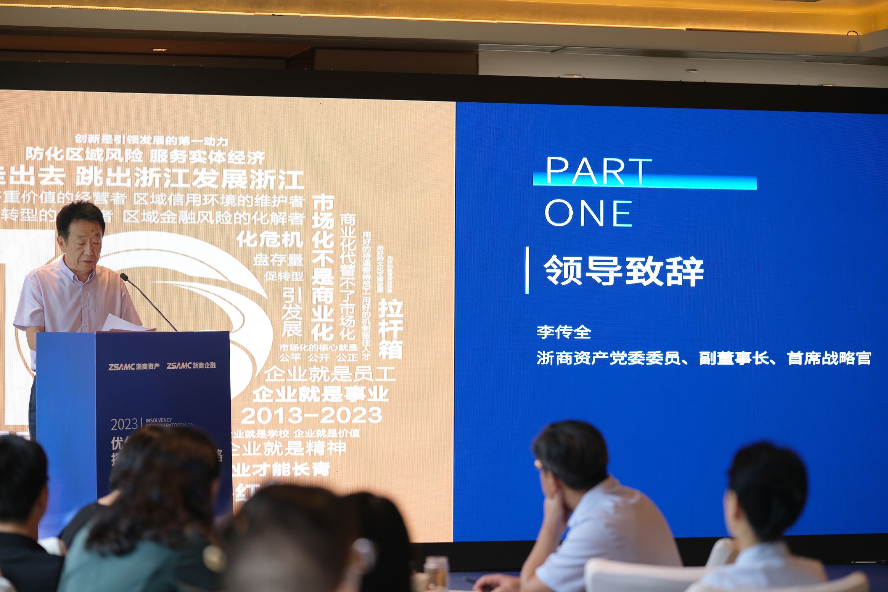 沙龍伊始,浙商資產黨委委員、副董事長、首席戰略官李傳全對地方AMC破產管理人履職和破產重整業務進行了全面解讀。他在致辭中表示,面對當前破產清算案件不斷攀升、破產重整需求逐步擴大的特殊投資機遇,地方AMC應積極介入破產業務領域,充分發揮自身逆周期金融救助功能,通過專業化重整重組手段最大限度挖掘潛在價值,幫助企業恢復正常運營能力。同時,地方AMC應加強協作、共享發展機遇,共同推動行業在破產業務領域上邁向新臺階、取得新突破。