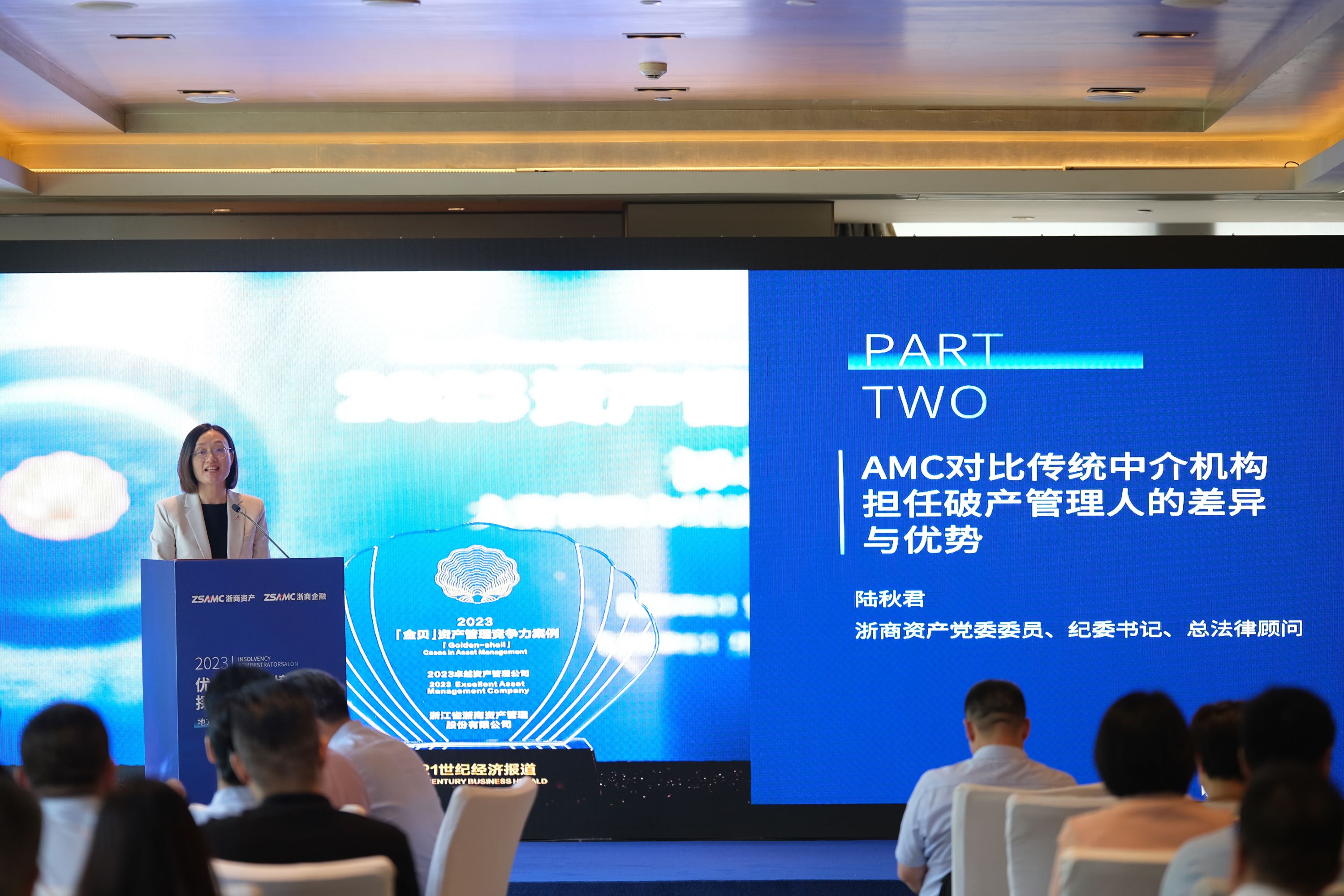 浙商資產黨委委員、紀委書記、總法律顧問陸秋君從專業經驗、治理結構、人才配置、資源整合、資金融通等方面著重分析了AMC對比傳統中介機構在擔任破產管理人方面的比較優勢,并指出AMC應準確把握當前經濟社會發展新形勢,加強破產管理業務的雙向加速賦能,依照前瞻化、市場化、法治化原則,因地制宜,采取債權轉讓、托管、債務重組、資產重組、共益債、破產重整、市場化債轉股、財務顧問等多種方式化解風險,充分發揮地方AMC功能作用。