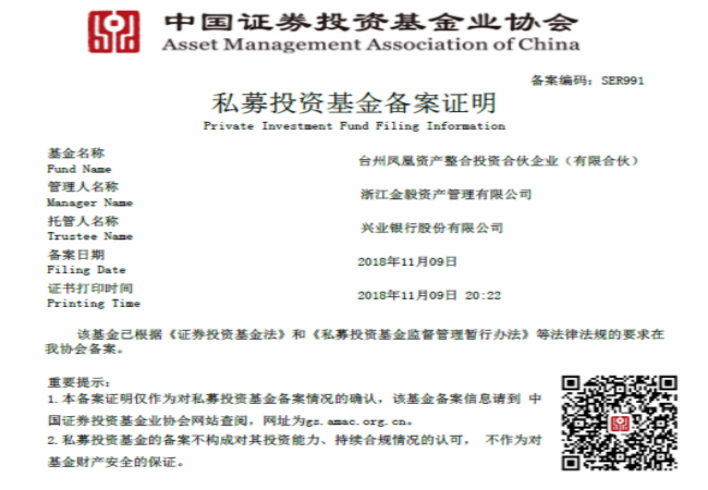 2018年11月9日,由浙商資產(chǎn)下屬金毅資產(chǎn)(私募基金管理人)發(fā)起設(shè)立的有限合伙型私募投資基金——臺州鳳凰資產(chǎn)整合投資合伙企業(yè)基金(有限合伙)(備案編碼:SER991)順利通過中國證券投資基金業(yè)協(xié)會備案,標(biāo)志著該基金順利完成運(yùn)營前所有審批工作,即將進(jìn)入正式運(yùn)行。