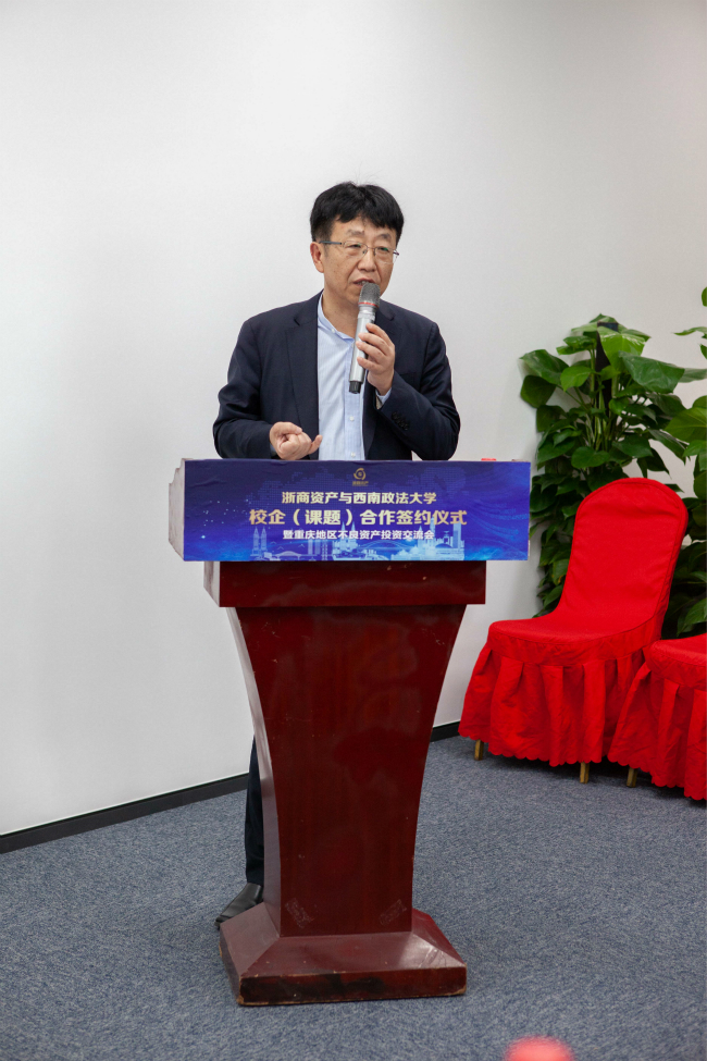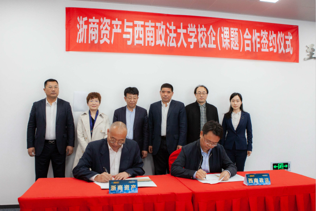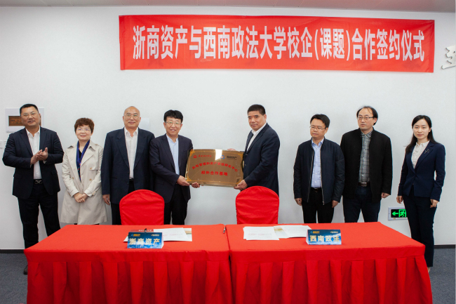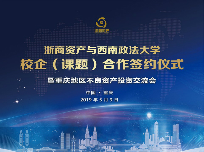 2019年5月9日上午,值川渝(重慶)辦事處開業之際,浙商資產舉辦了與西南政法大學校企(課題)合作簽約儀式暨重慶地區不良資產投資交流會。浙商資產常務副總經理兼首席戰略官李傳全、業務副總經理吳張根、總經理助理兼財務總監宮娟,西南政法大學副校長商文江、人工智能法學院院長陳亮等出席簽約儀式。