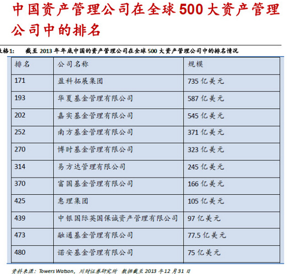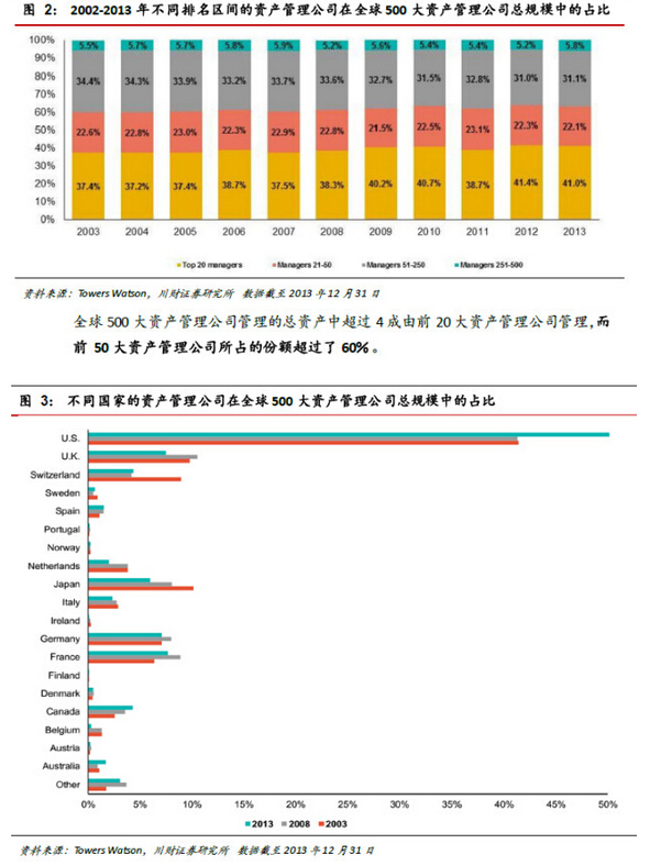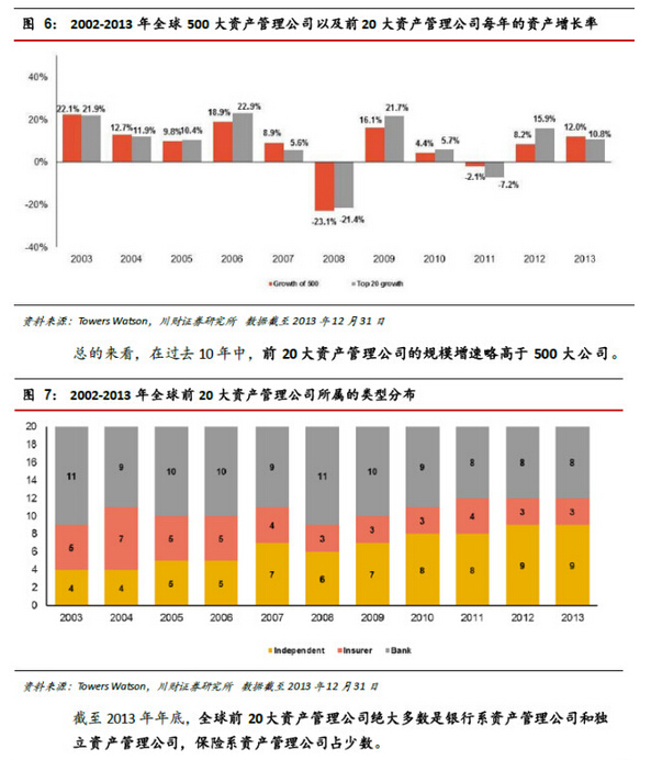 3.其它:1)截至2013 年年底,全球前20 大資產(chǎn)管理公司中有12 家自美國,8 家來自歐洲;絕大多數(shù)是銀行系和獨立資產(chǎn)管理公司,保險資產(chǎn)管理公司占少數(shù);2)中國大陸的資產(chǎn)管理公司只有華夏基金管理有限公司一家勉強(qiáng)進(jìn)入前200 名,而巴西卻有4 家資產(chǎn)管理公司排在前100名以內(nèi),中國的資產(chǎn)管理行業(yè)潛力巨大且任重道遠(yuǎn)。