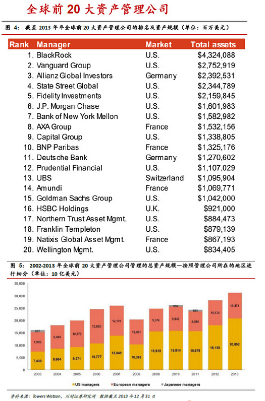 2013 年,全球前20大資產(chǎn)管理公司中有12家是美國公司,其余8家全是歐洲公司;