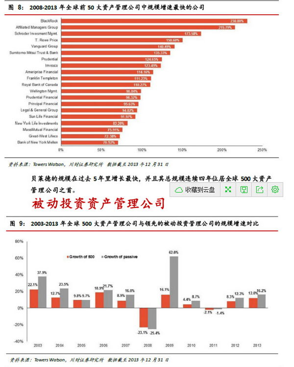 2.關(guān)于領(lǐng)先的被動投資資產(chǎn)管理公司:2003 年以來,領(lǐng)先的被動投資產(chǎn)產(chǎn)管理公司的規(guī)模增長迅速,年均復(fù)合增長率達(dá)到12.4%,而全球500大資產(chǎn)管理公司只有5.8%。